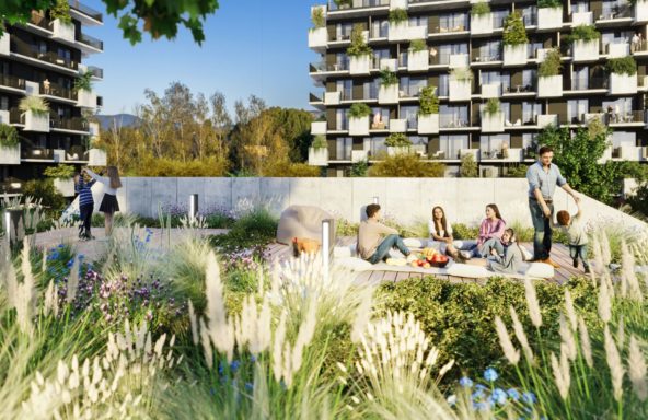 Všetky domy Kvetnice prikryje zelená strecha. Zelená bude dominovať aj vnútrobloku, kde okrem pohody nájdete aj vodnú plochu, ktorá pomôže v horúcich dňoch ochladzovať mikroklímu Kvetnice.